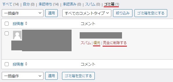 また、ゴミ箱で「ゴミ箱を空にする」をクリックするとゴミ箱に入っているコメントを一括で完全に削除することができます。